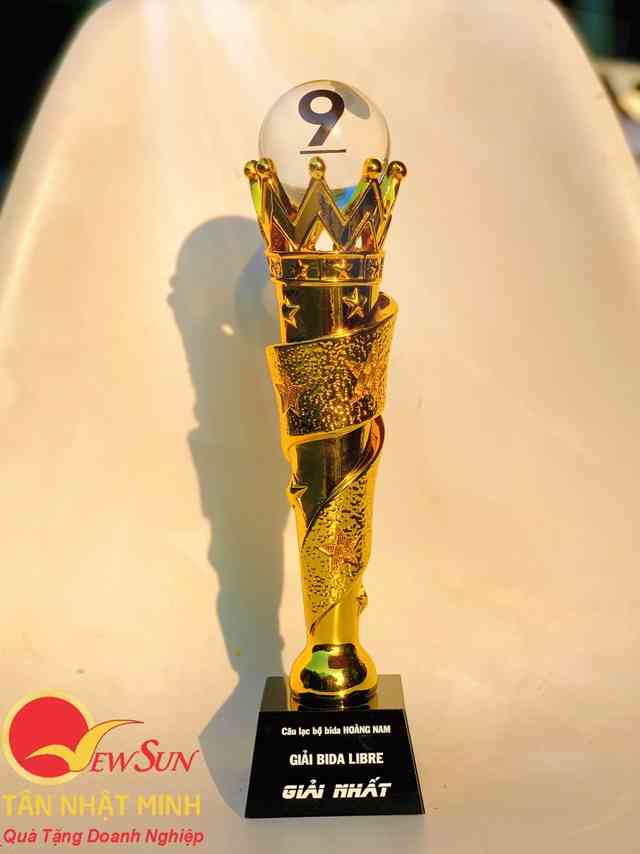 Cúp bida: Bida là môn thể thao yêu cầu sự đúng mực và kĩ năng cao. Cúp bida thường có thiết kế độc đáo, với hình ảnh các quả bi, gậy bida hoặc bàn bida được khắc hoặc đúc nổi trên thân cúp. Chất liệu làm cúp bida thường là kim loại, pha lê hoặc gỗ, tạo nên vẻ đẹp đẳng cấp và dẻo dai.
