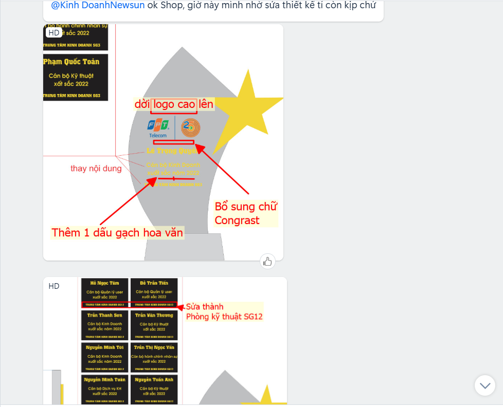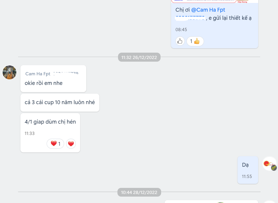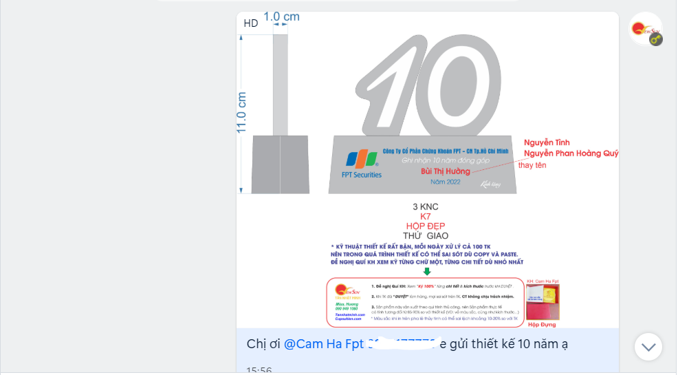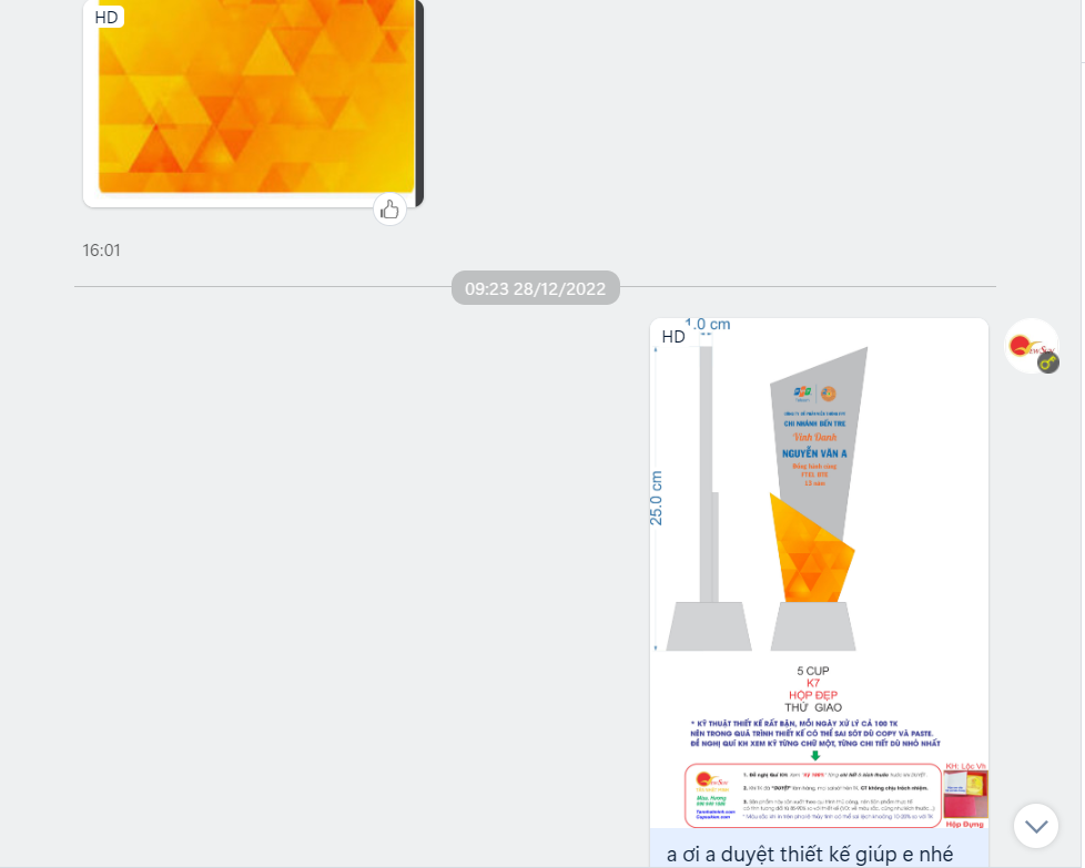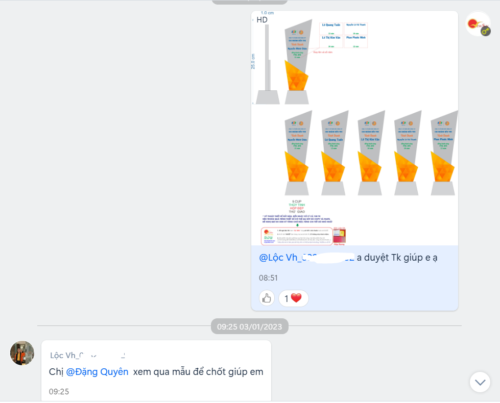 Đơn chị Hà khách cũ thì chỉ cần gửi thiết kế 1 lần là chị duyệt ngay vì đã làm việc với nhau nhiều đơn hàng khác rồi ạ. hihi.