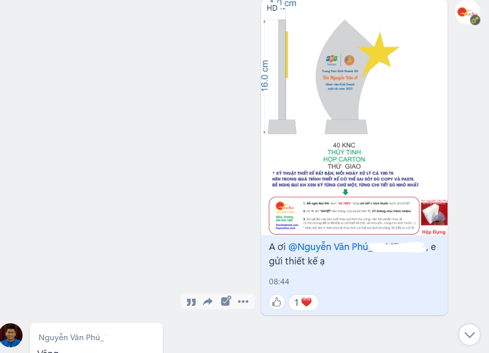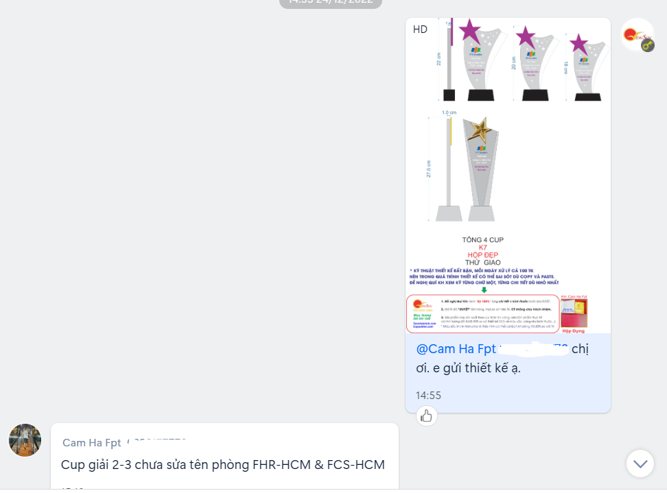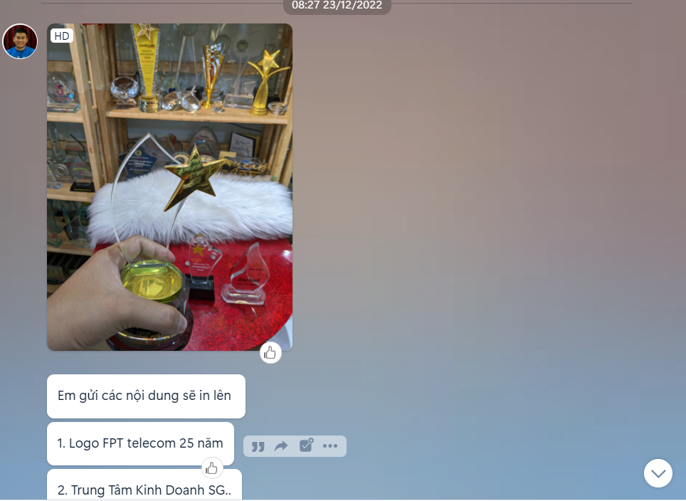 Ngoài anh Phú thì trong thời điểm này bên em cũng nhận được 2 đơn hàng từ chi nhánh của FPT các tính liên hệ đặt Kỷ niệm chương pha lê.