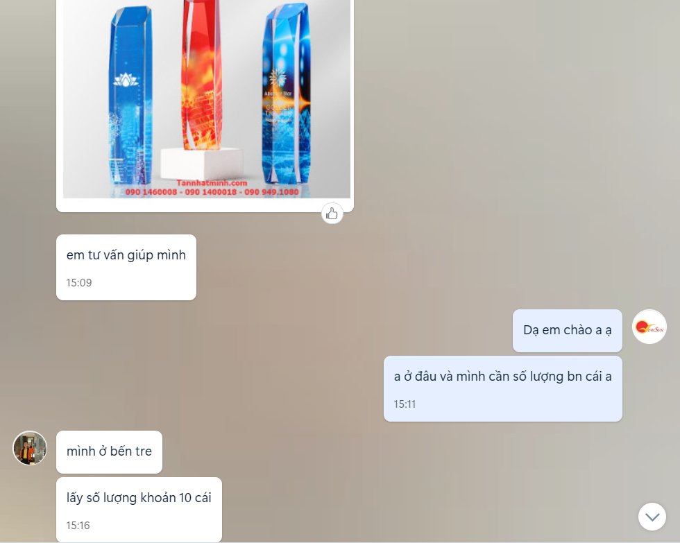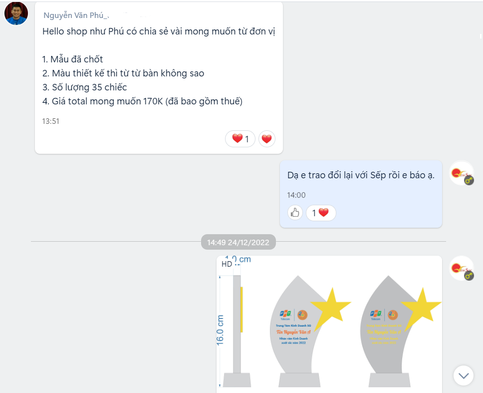 Đoạn hội thoại giữa kinh doanh nhà Tân Nhật Minh và khách chủ yếu hỗ trợ nhau lên thiết kế, chỉnh sửa thiết kế, duyệt thiết kế để lúc làm ra thành phẩm được tròn vẹn nhất.