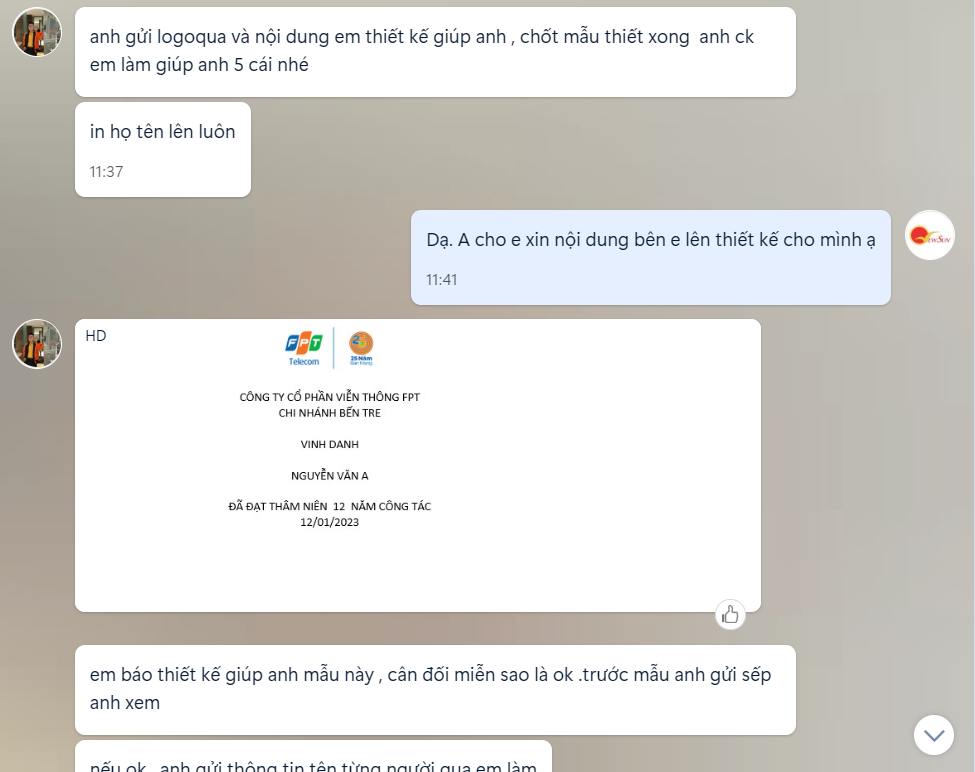 Anh trai ở FPT đến trực tiếp văn phòng Công ty tham khảo, xem mẫu trực tiếp và sau đó cũng chọn được mẫu ưng ý và tiến hành gửi nội dung lên thiết kế.